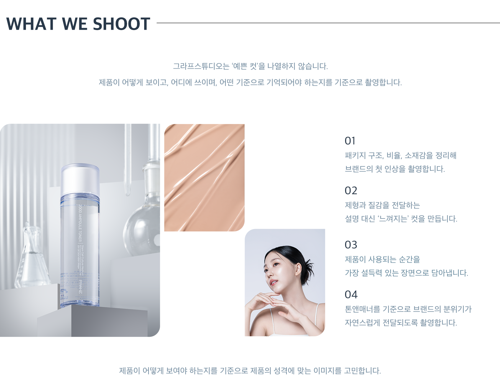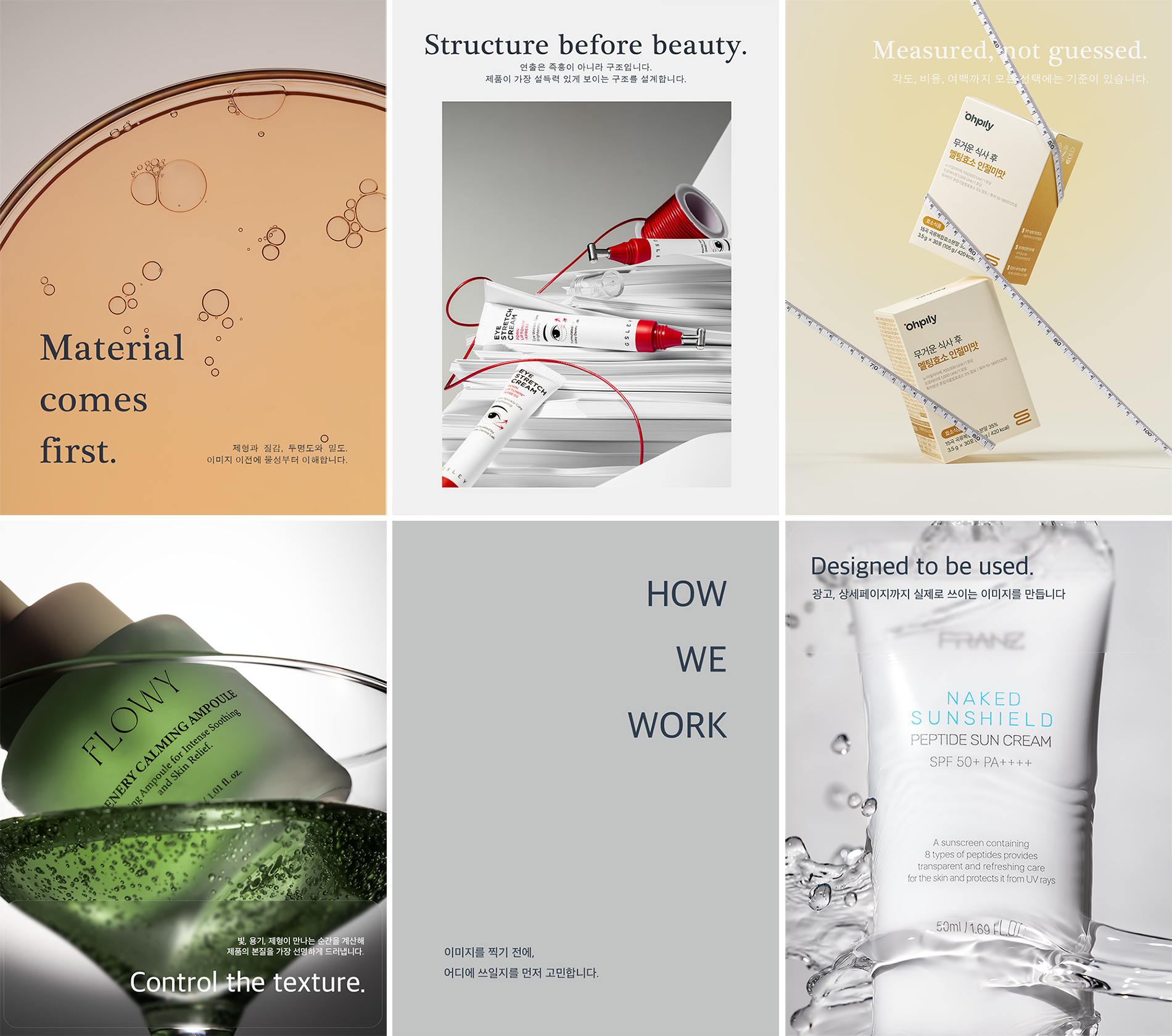 화장품과 식품을 중심으로 기획부터 촬영, 그리고 결과물의 실제 활용까지 고려해쓰임이 분명한 이미지를 이끌어냅니다.